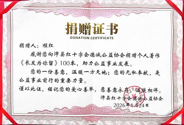 2026年1月24日下午,沛縣紅十字會(huì)德誠(chéng)公益協(xié)會(huì)年會(huì)現(xiàn)場(chǎng)舉行了一場(chǎng)溫暖的圖書(shū)捐贈(zèng)儀式。大屯煤電中心醫(yī)院職工,江蘇省作協(xié)、中國(guó)煤礦作協(xié)會(huì)員程紅女士向協(xié)會(huì)捐贈(zèng)100冊(cè)個(gè)人著作。德誠(chéng)公益協(xié)會(huì)為程紅頒發(fā)捐贈(zèng)證書(shū)。