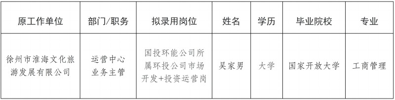 根據(jù)《徐州市國有資產(chǎn)投資經(jīng)營集團有限公司招聘工作人員公告》規(guī)定程序,招聘工作經(jīng)過報名、資格審查、面試等程序,現(xiàn)將公開招聘擬錄用人員名單進行公示。公示期自2023年4月20日起至4月25日止。如對公示對象錄用資格有異議的,請于公示期內向國投環(huán)能公司黨群與人力資源部反映。