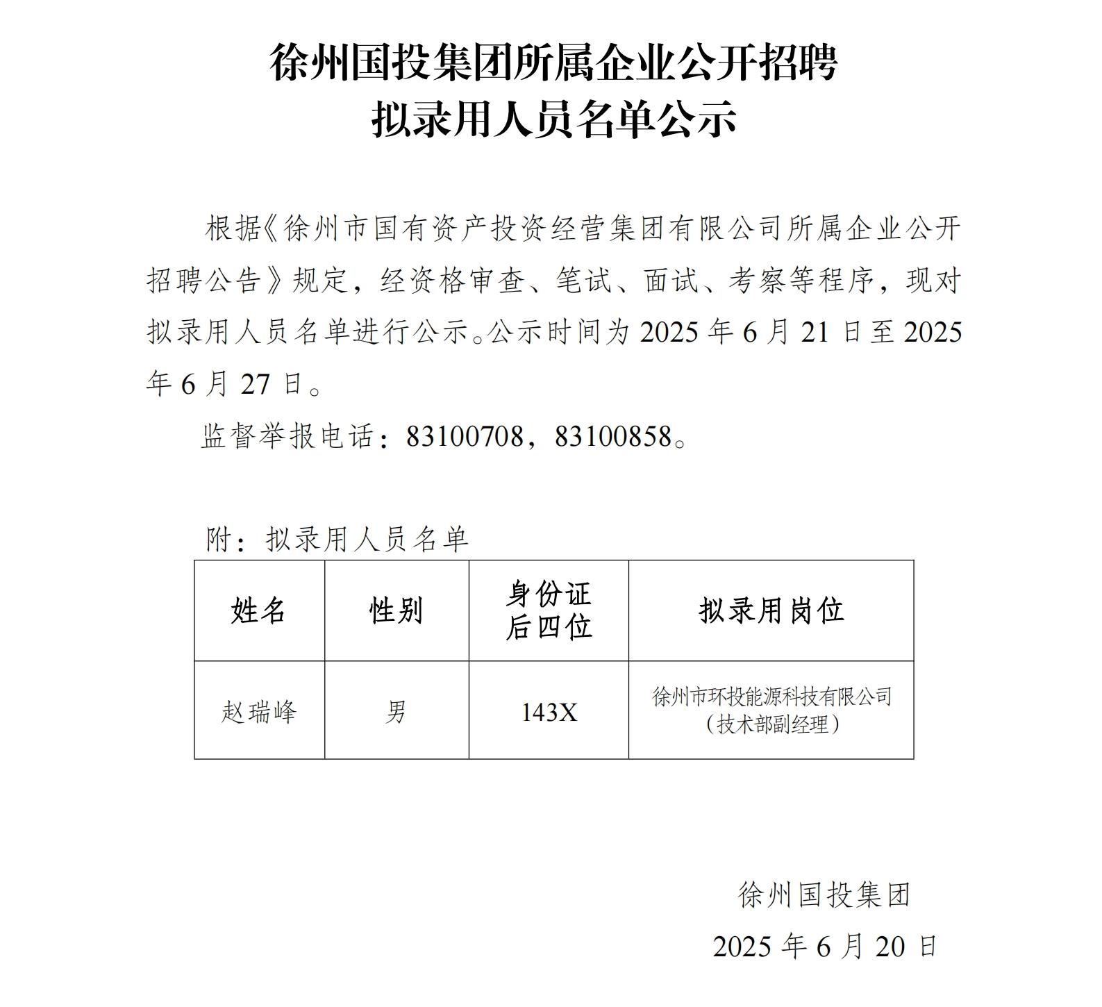 徐州國投集團(tuán)所屬企業(yè)公開招聘擬錄用人員名單公示