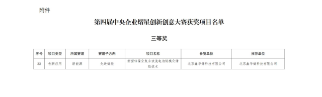 1月3日,國務院國資委發(fā)布《關于第四屆中央企業(yè)熠星創(chuàng)新創(chuàng)意大賽獲獎名單的通報》,徐州國投集團基金投資先進儲能賽道項目北京鑫華儲科技有限公司獲得三等獎。