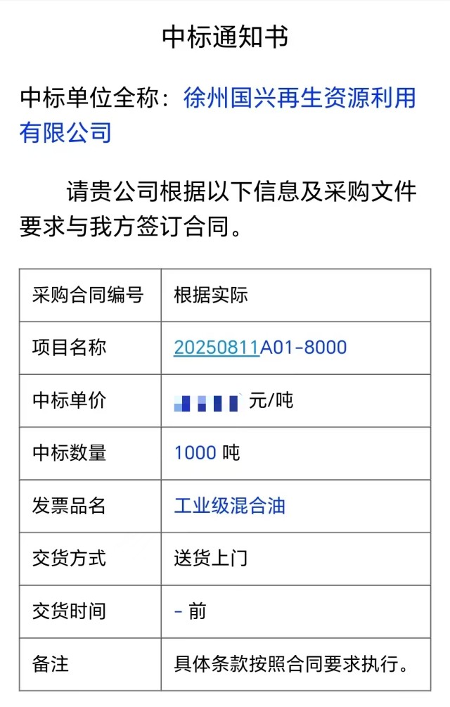 8月12日,徐州國興再生資源利用有限公司迎來重大突破——成功中標(biāo)連云港嘉澳新能源有限公司1000噸工業(yè)級混合油(UCO)采購項(xiàng)目(中標(biāo)編號:20250811A01-8000)。這是國興公司首次實(shí)現(xiàn)千噸級工業(yè)級混合油貿(mào)易,標(biāo)志著集團(tuán)公司在生物質(zhì)能源領(lǐng)域的市場開辟新道路,也為企業(yè)建立零碳工廠邁出堅(jiān)實(shí)的一步。