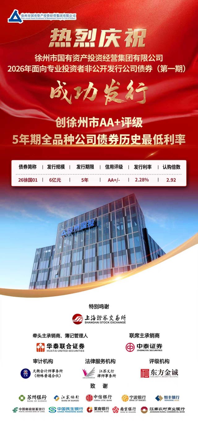 近日,徐州國(guó)投集團(tuán)2026年面向?qū)I(yè)投資者非公開(kāi)發(fā)行公司債券(第一期)——“26徐國(guó)01”成功發(fā)行,獲得資本市場(chǎng)積極響應(yīng)。